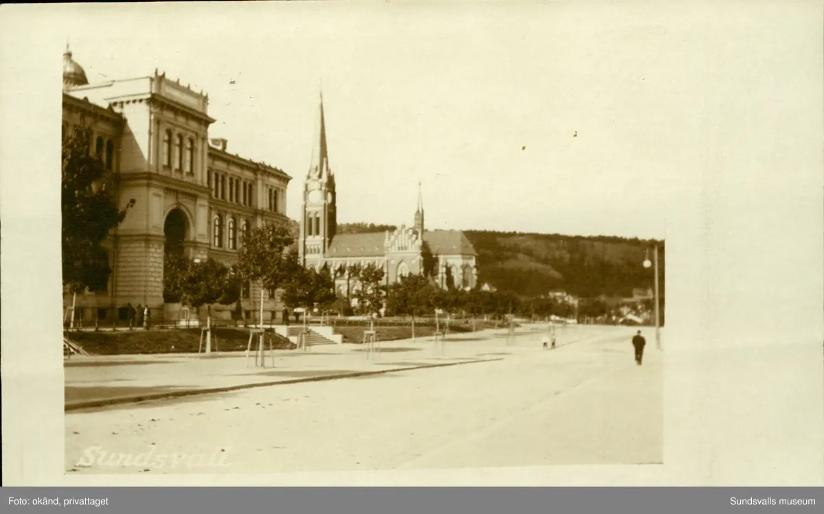 Vykort med motiv över Gustav Adolfs kyrka i Sundsvall.