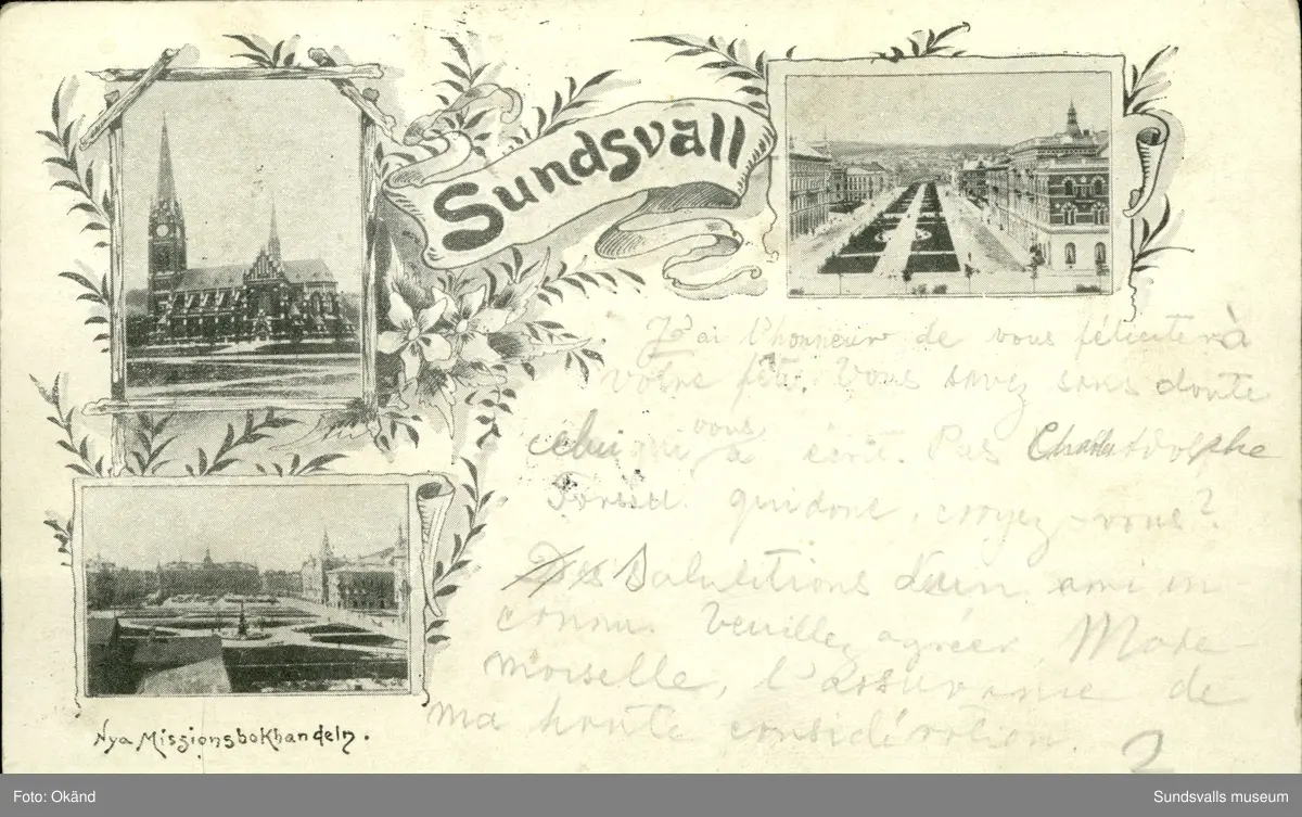 Vykort med motiv av Gustav Adolfskyrka, Esplanaden och Vängåvan i Sundsvall.