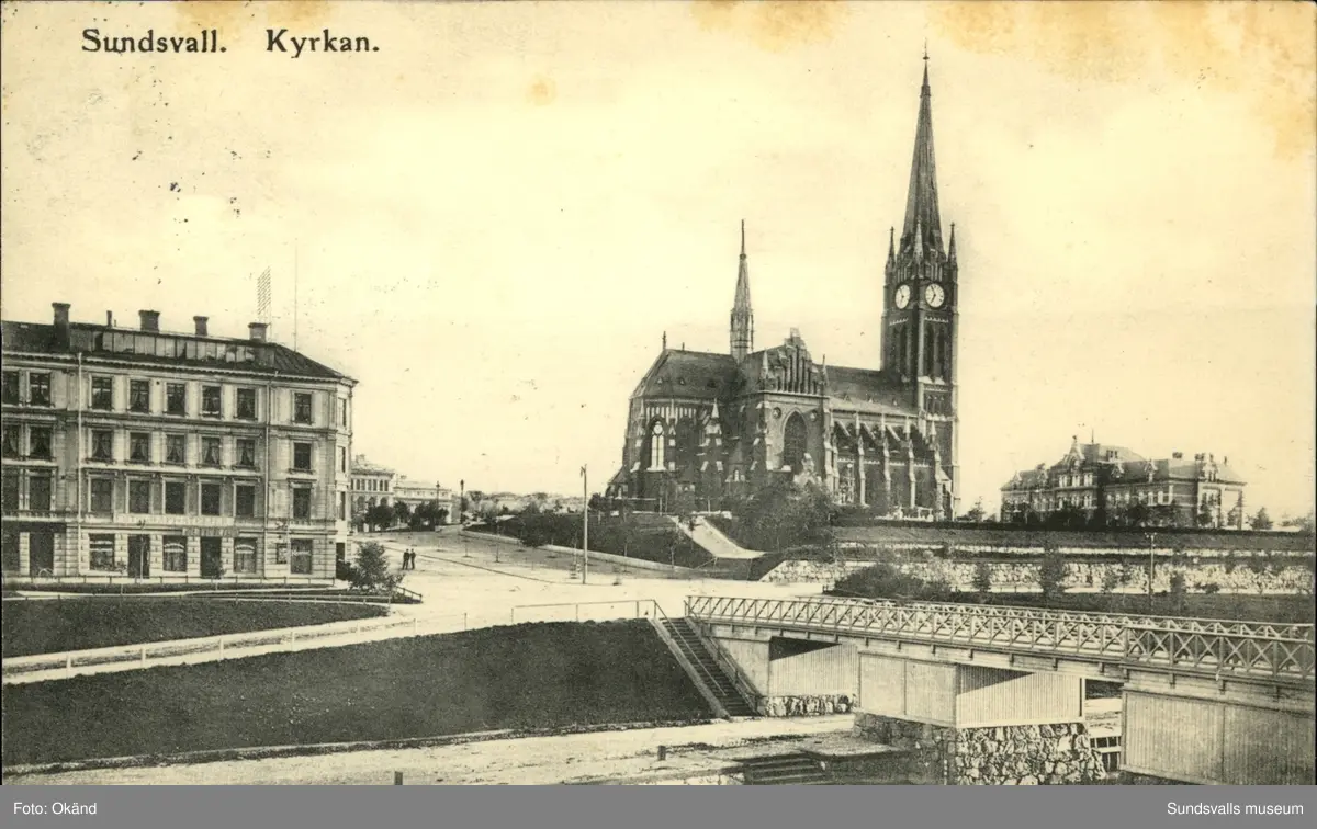 Vykort med motiv över Gustav Adolfs kyrka i Sundsvall.