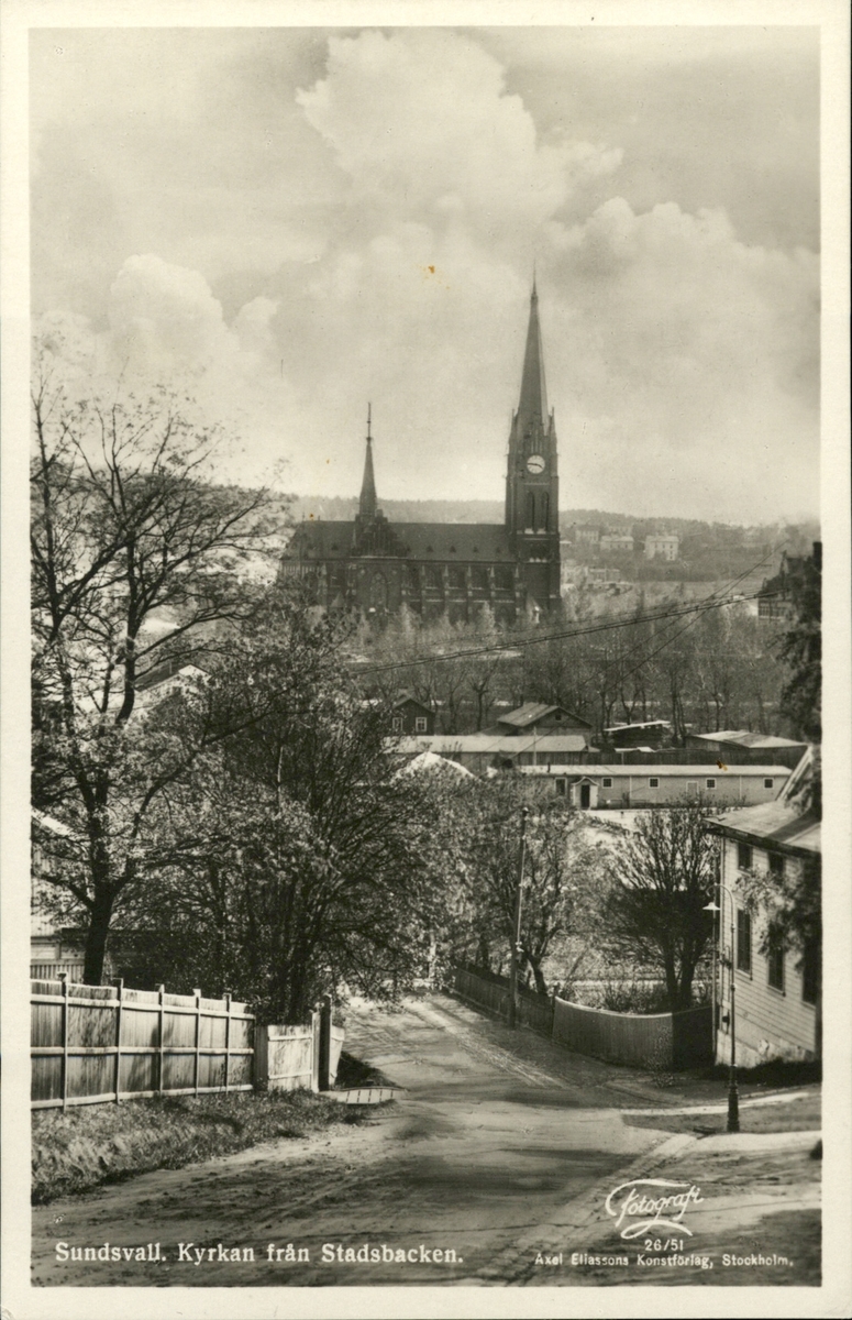 Vykort med motiv på Gustav Adolfskyrka från stadsbacken i Sundsvall.