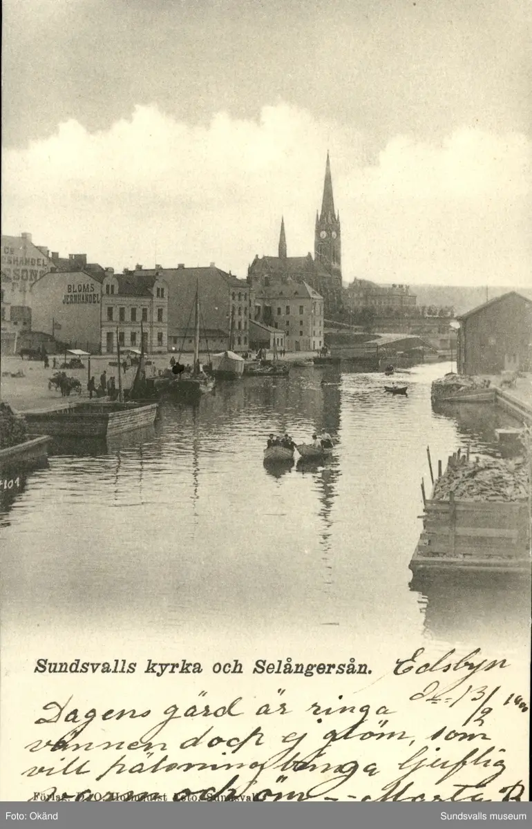 Vykort med motiv över Gustav Adolfs kyrka och Selångersån i Sundsvall.