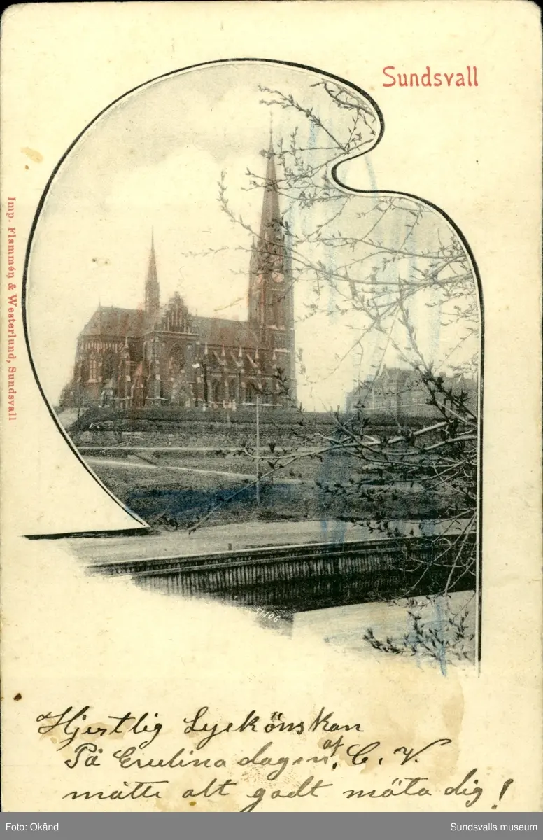 Vykort med motiv över Gustav Adolfs kyrka i Sundsvall.