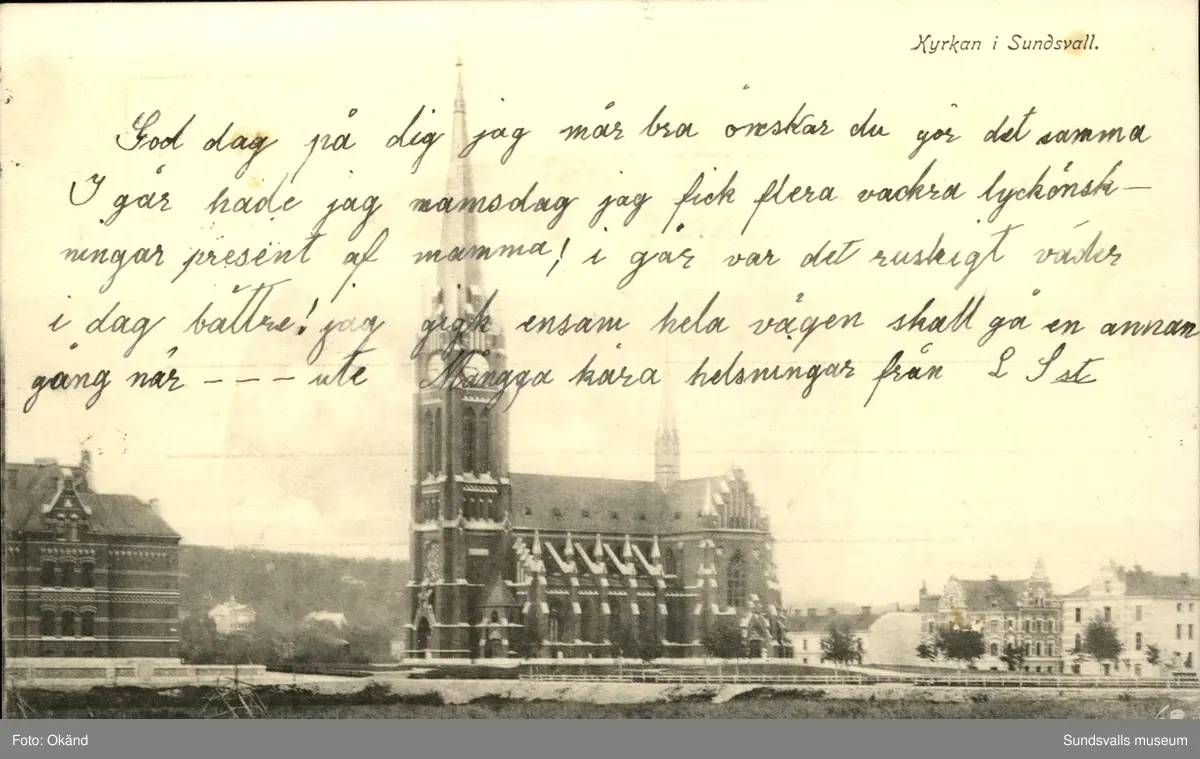 Vykort med motiv över Gustav Adolfs kyrka i Sundsvall.