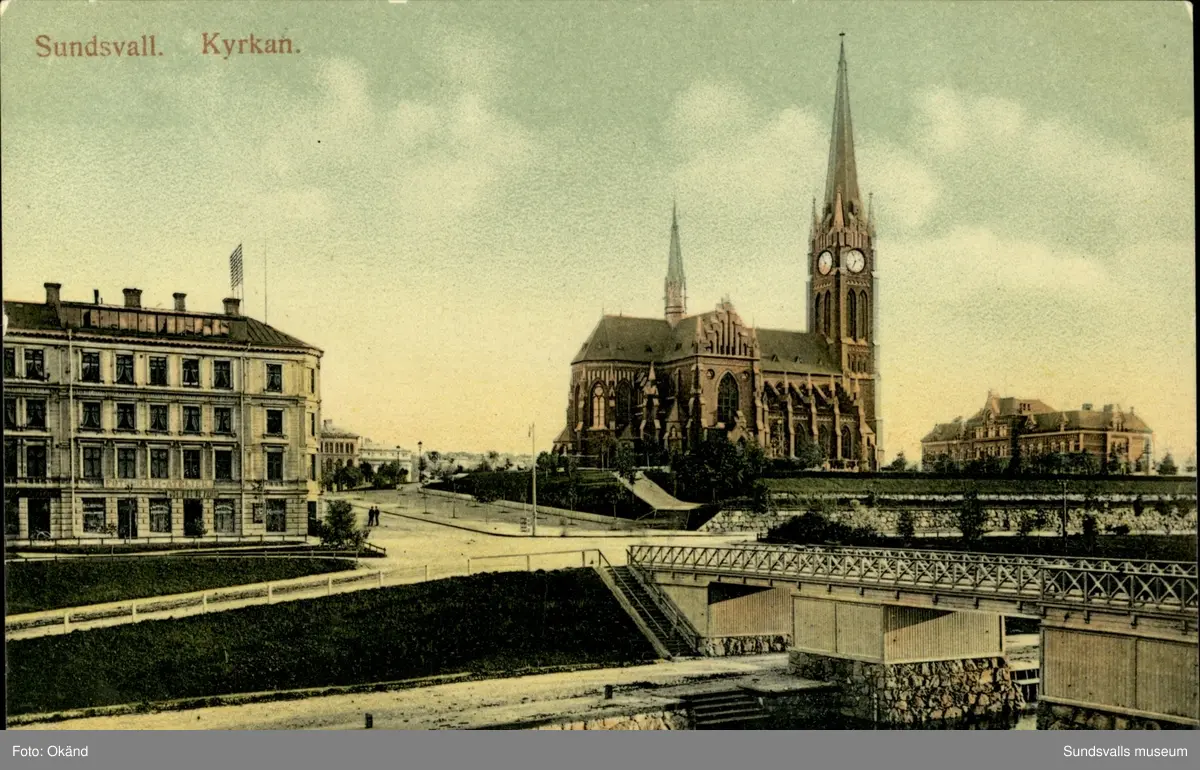 Vykort med motiv över Gustav Adolfs kyrka och Storbron.