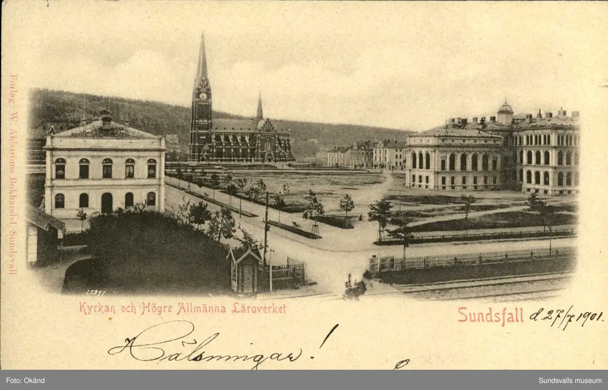 Vykort med motiv över Gustav Adolfs kyrka och Högre Allmänna Läroverket i Sundsvall.
