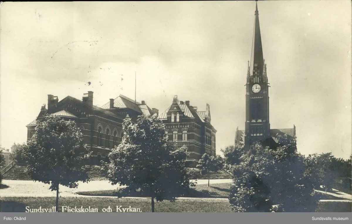 Vykort med motiv över Flickskolan och Gustav Adolfs kyrka.