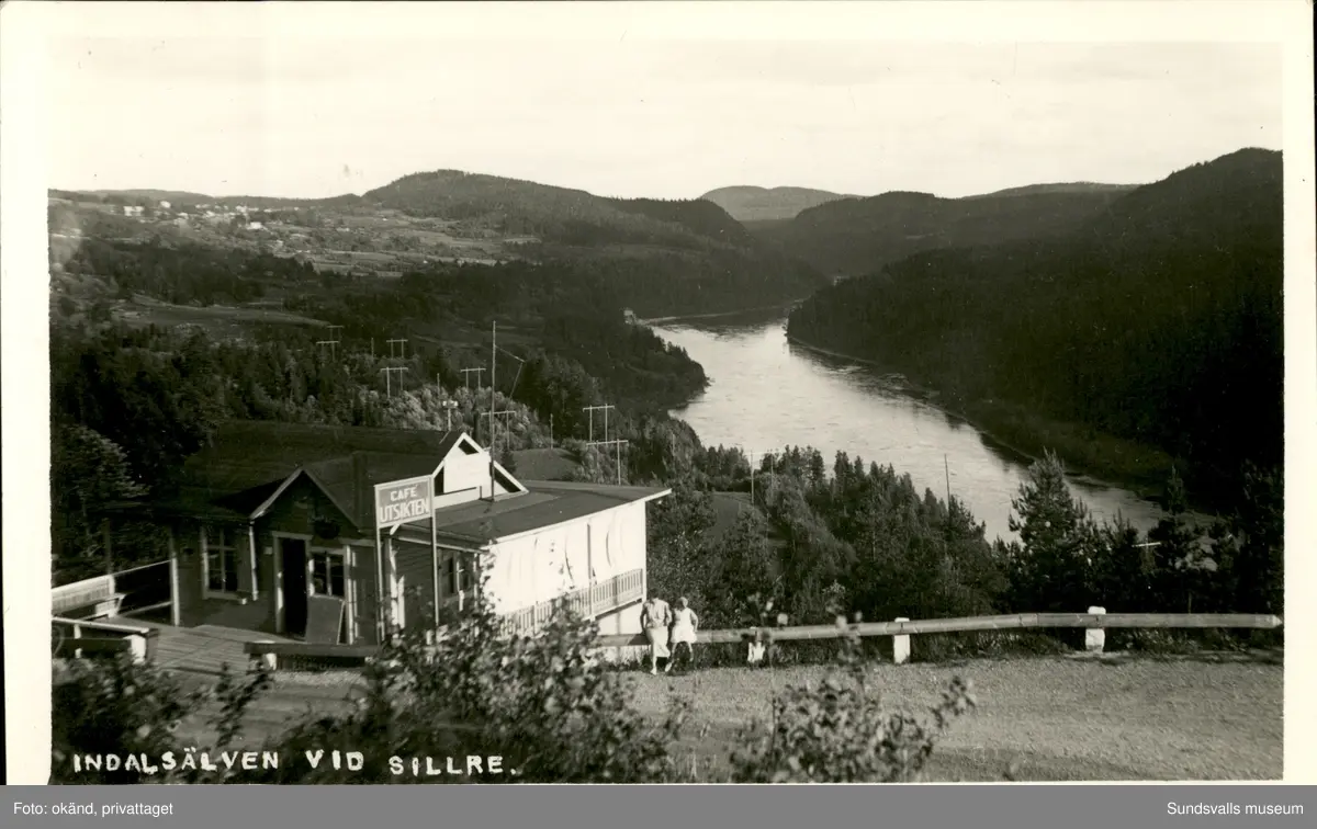 Vykort med motiv över Indalsälven och Café Utsikten vid Sillre.