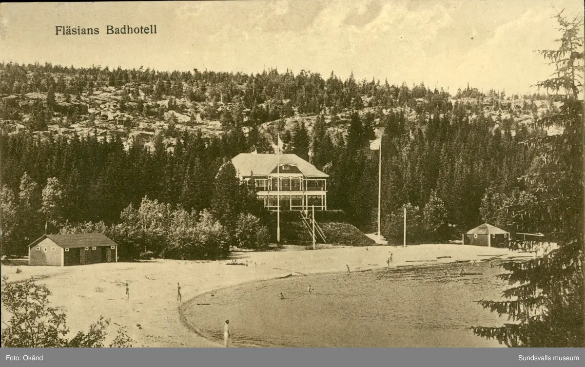Vykort med motiv över badhotellet vid Fläsian i Sundsvall.