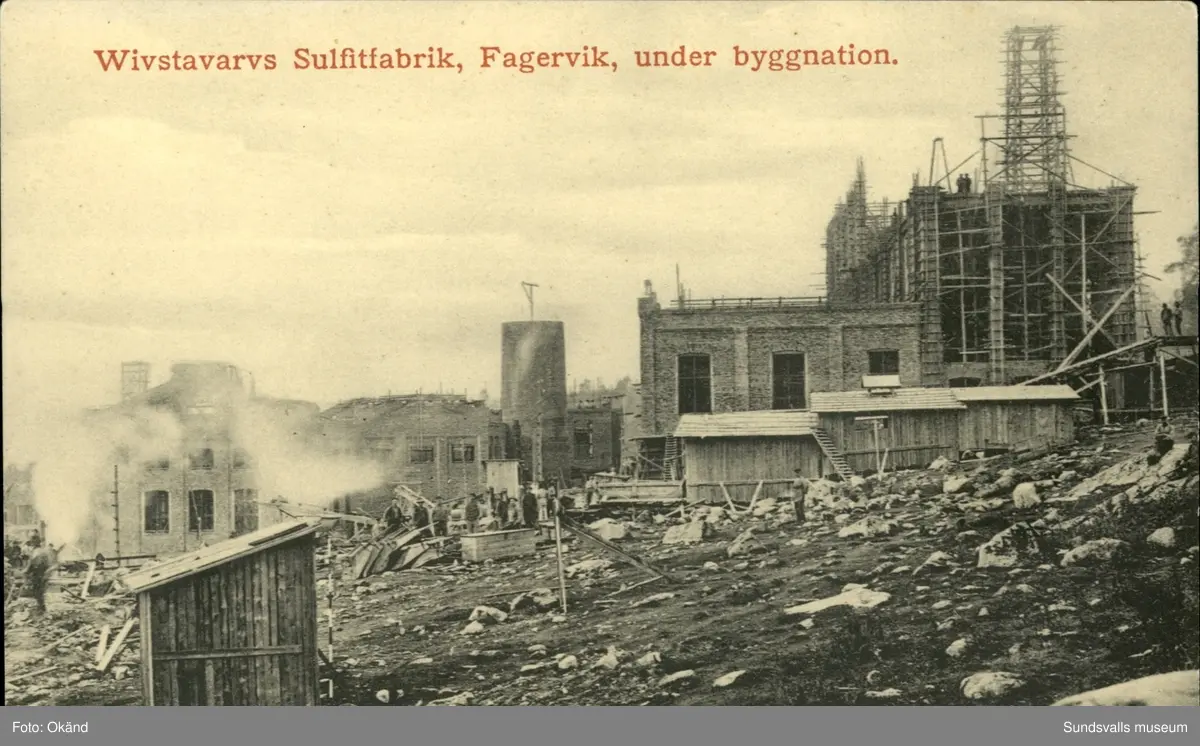 Vykort med motiv över Vivstavarvs Sulfitfabrik i Fagervik under uppbyggnad.