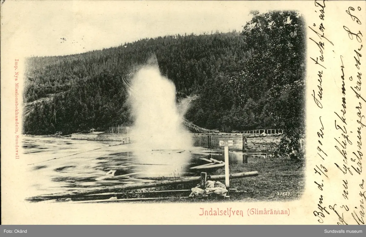 Vykort med motiv över Glimåns timmeränna vid Indalsälven.