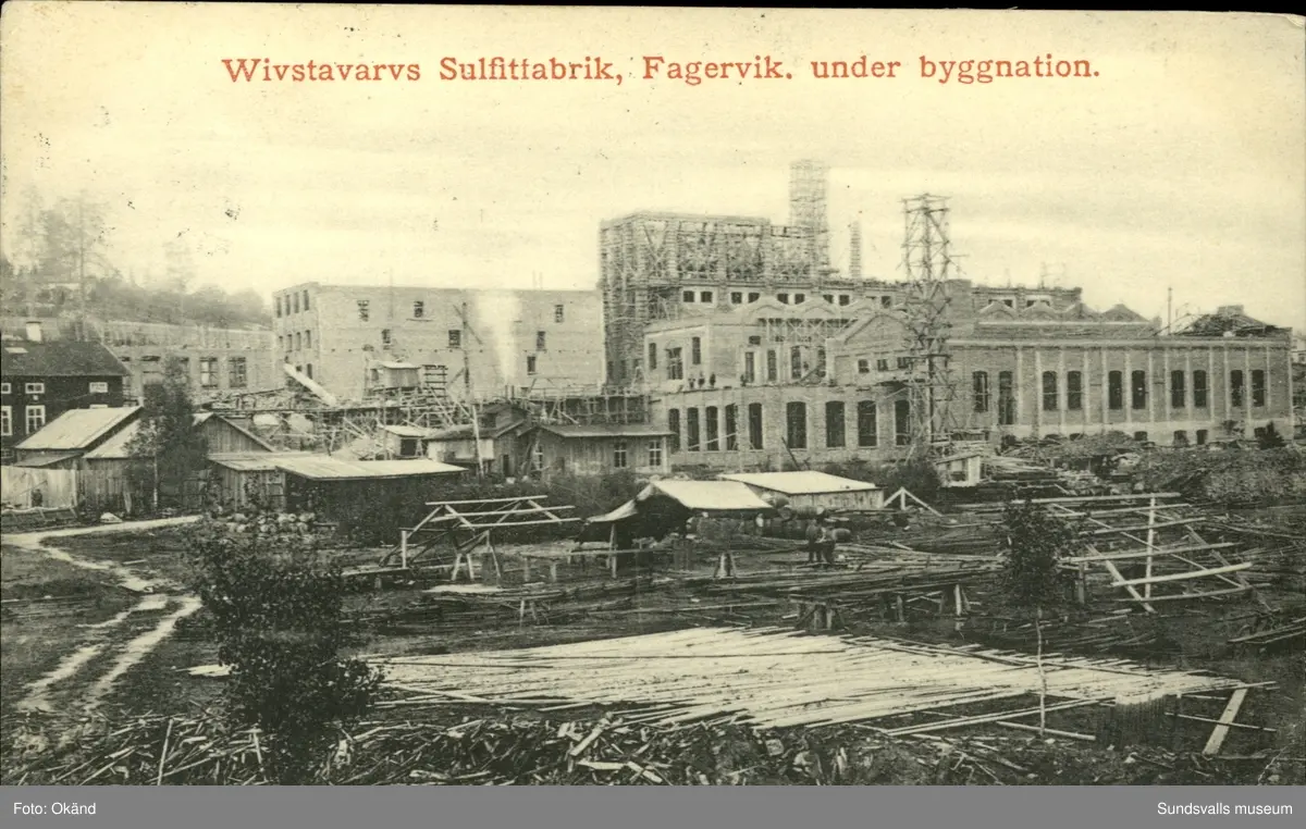 Vykort med motiv över Vivstavarvs Sulfitfabrik i Fagervik under uppbyggnad.