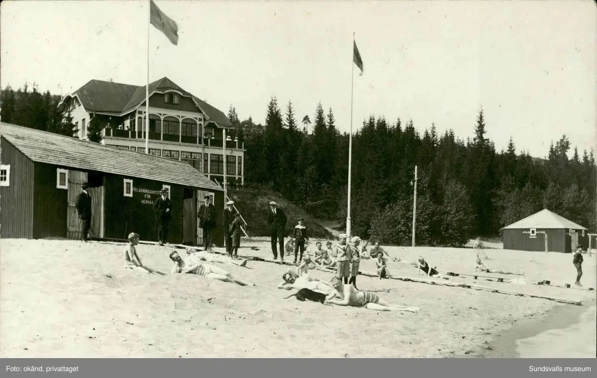 Vykort med motiv över badgäster till Badhotellet vid Fläsians havsbad utanför Sundsvall.