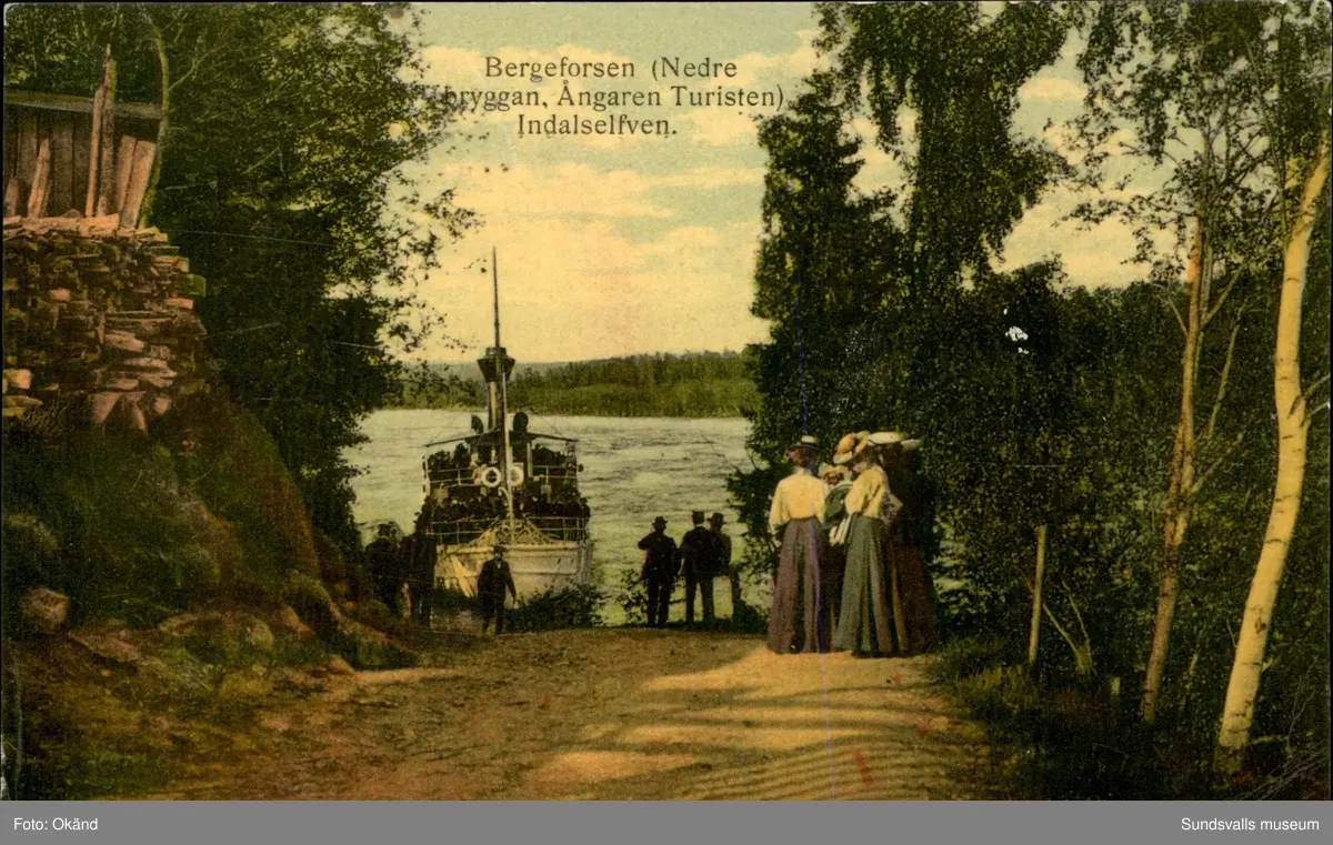 Vykort med motiv över den nedre bryggan och ångaren Turisten i Indalsälven vid Bergeforsen.