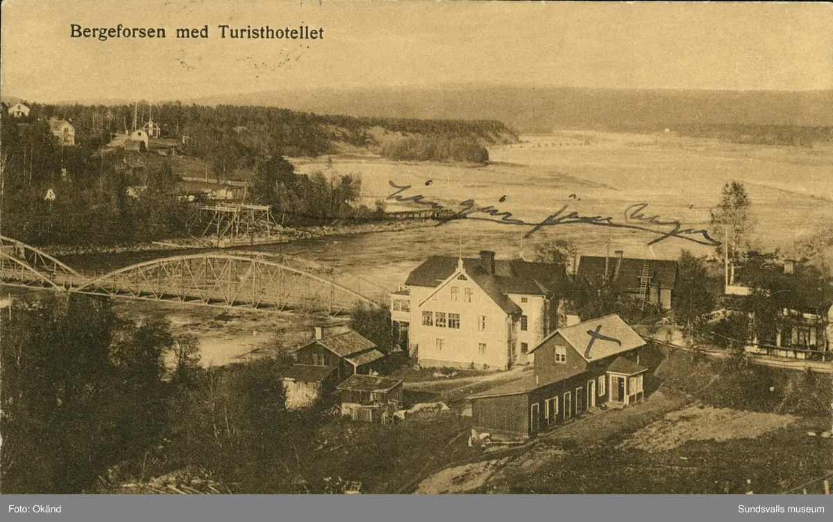 Vykort med motiv över Bergeforsen med turisthotellet.