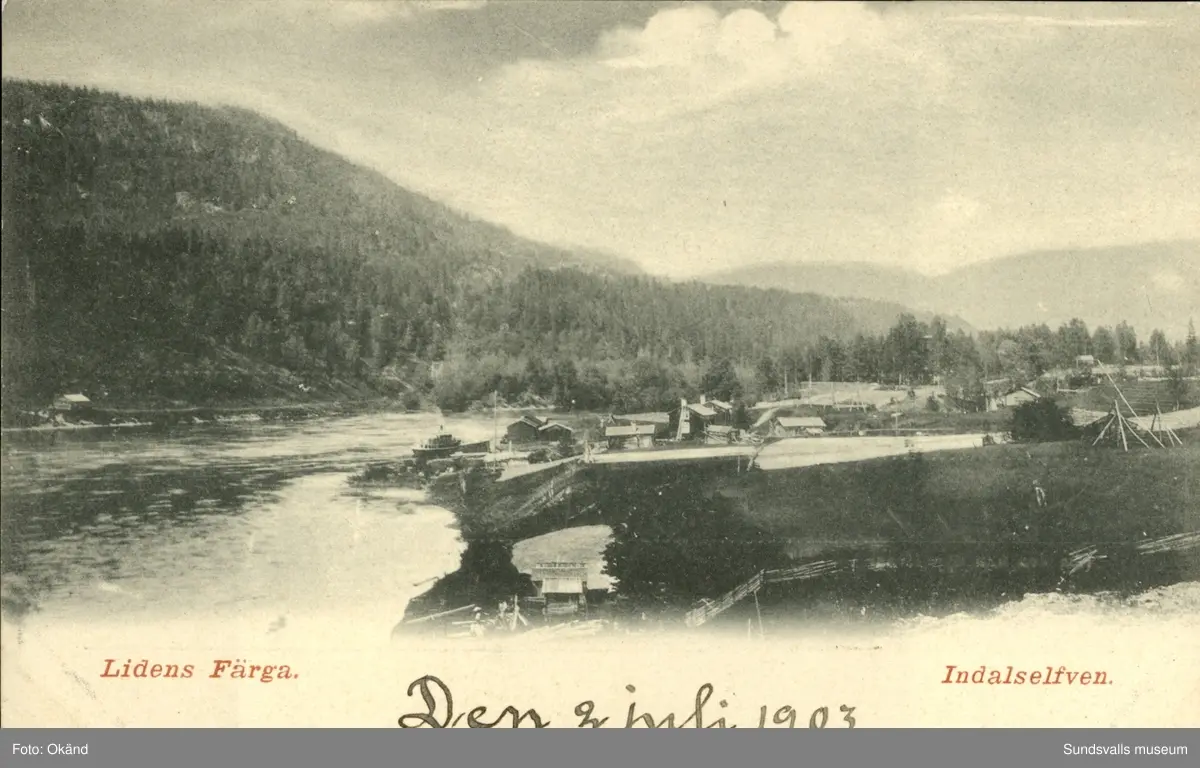 Vykort med motiv över Lidenfärja som trafikerade Indalsälven.