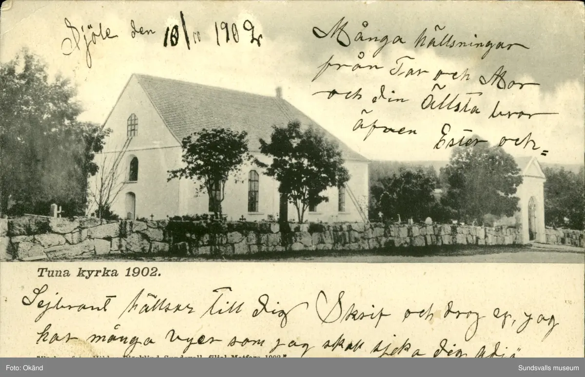 Vykort med motiv över Tuna kyrka i Matfors utanför Sundsvall.