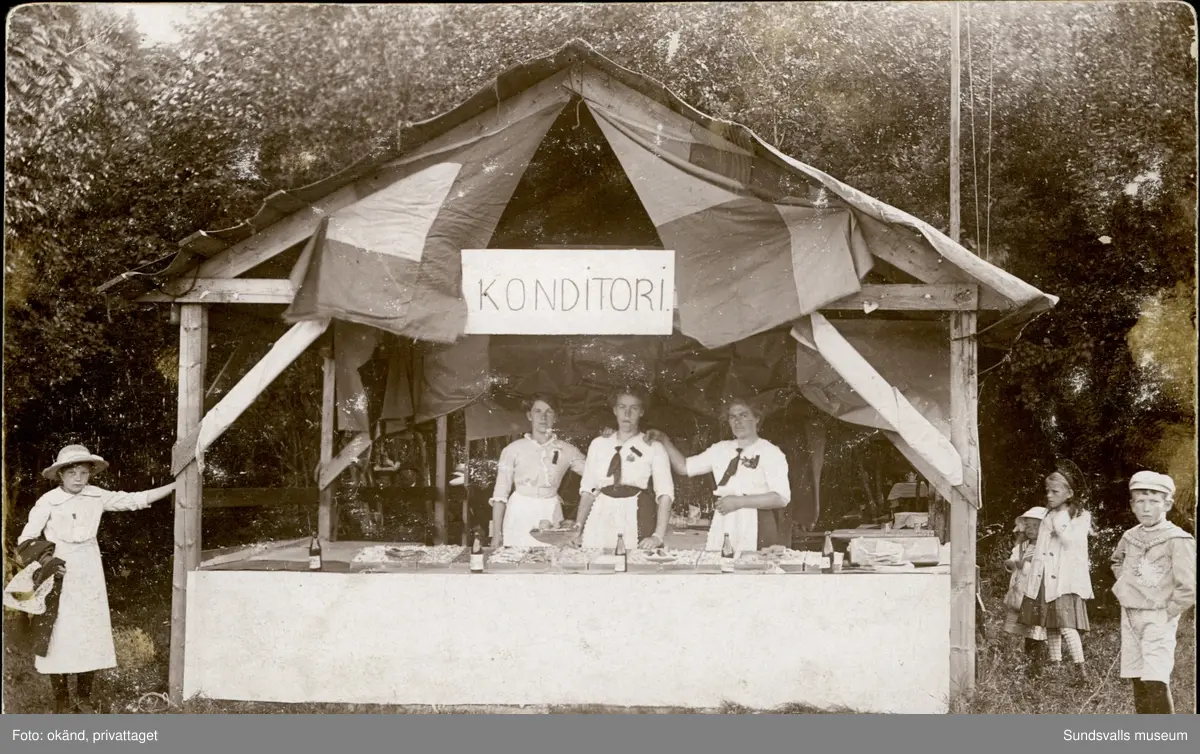 Vykort med motiv av ett marknadsstånd med skylten konditori. Enligt texten på baksidan: Wärstaparken 26 juli 1914.