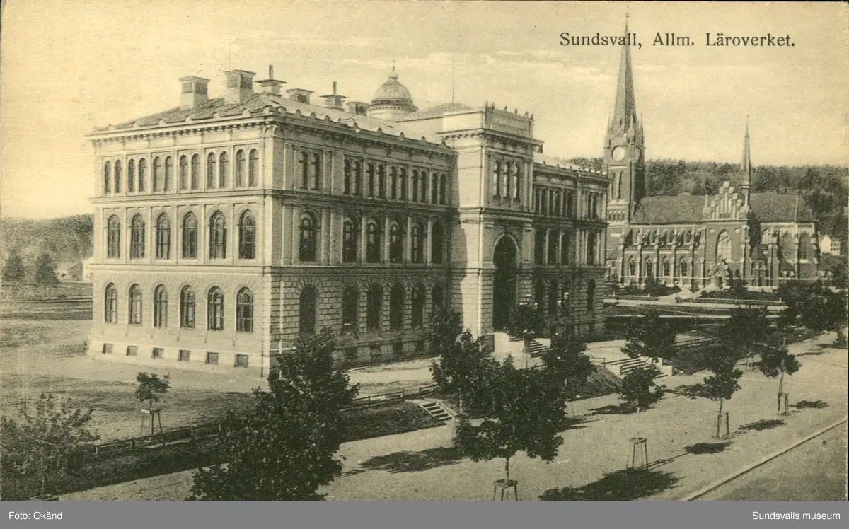Vykort med motiv över Allmänna läroverket i Sundsvall.