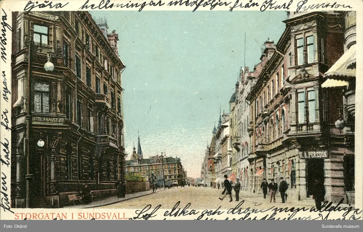 Vykort med motiv över Storgatan i Sundsvall.