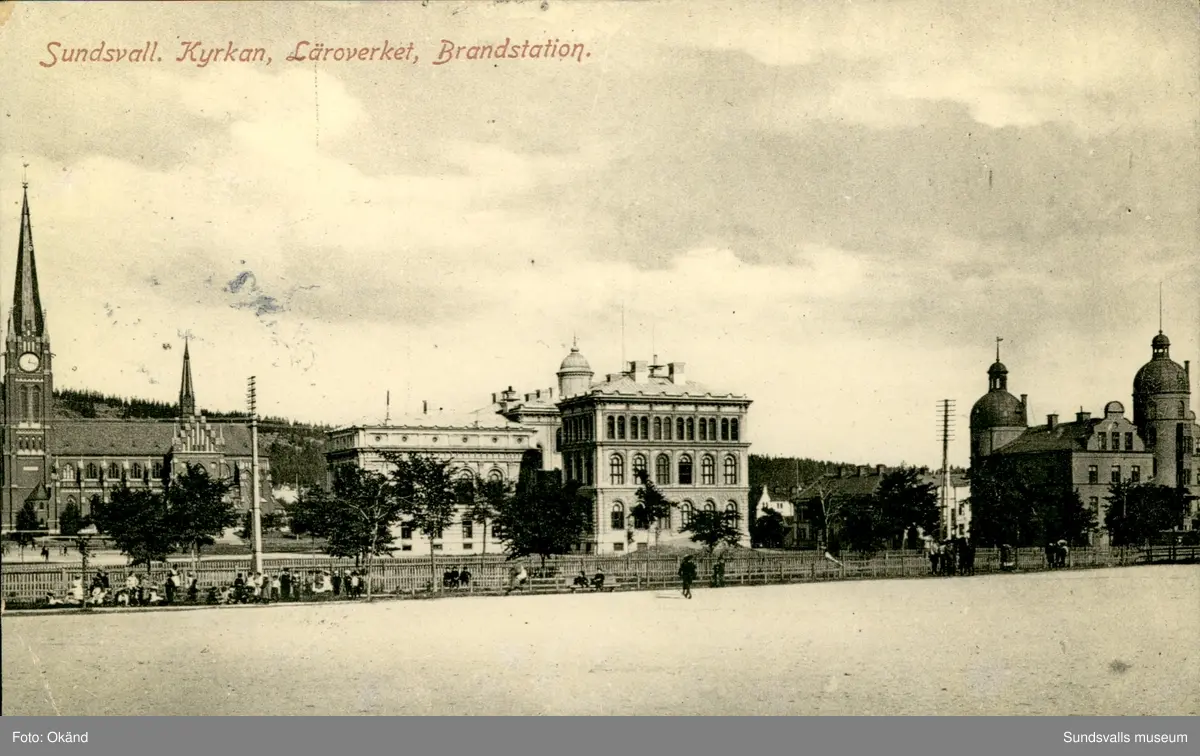 Vykort med motiv över kyrkan, läroverket och brandstationen i Sundsvall.