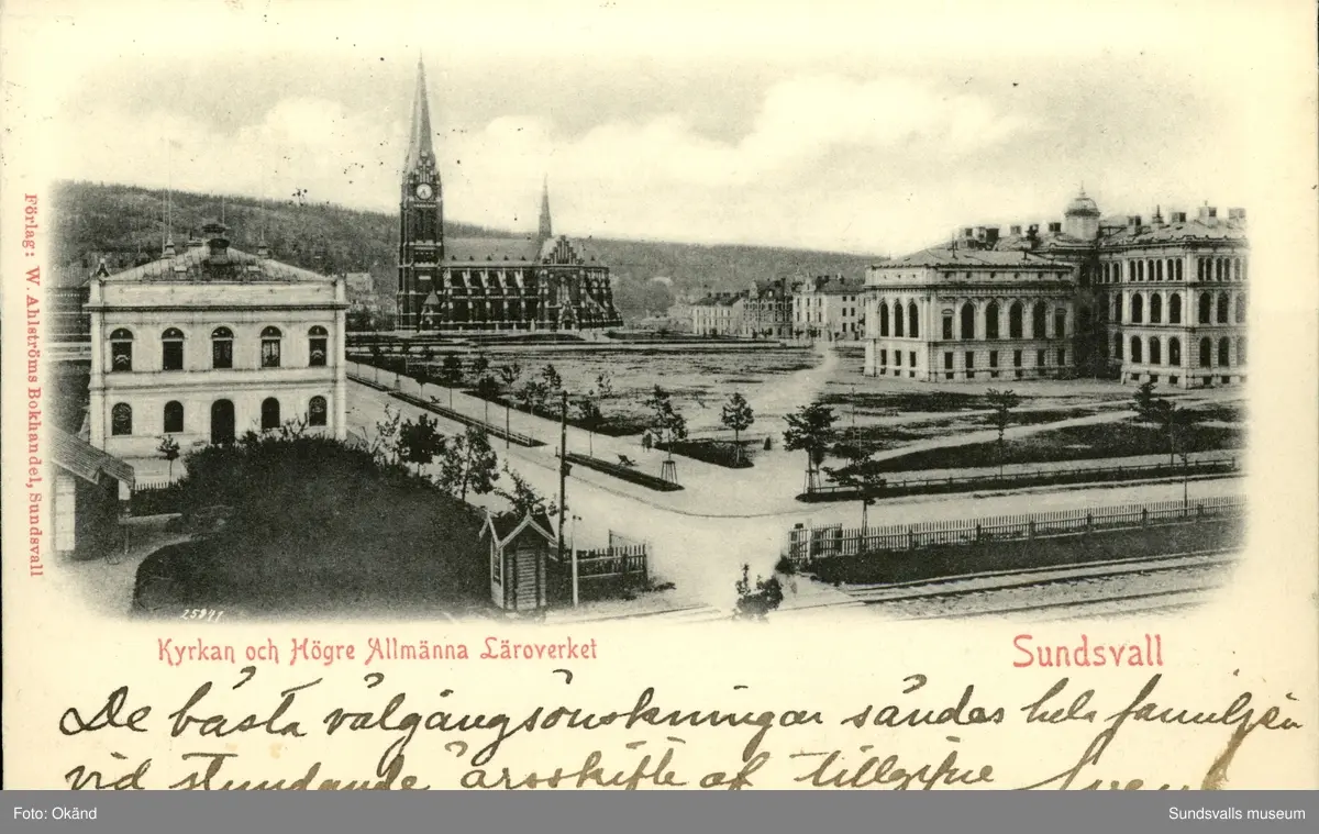 Vykort med motiv över Kyrkan och Högre allmänna läroverket i Sundsvall.