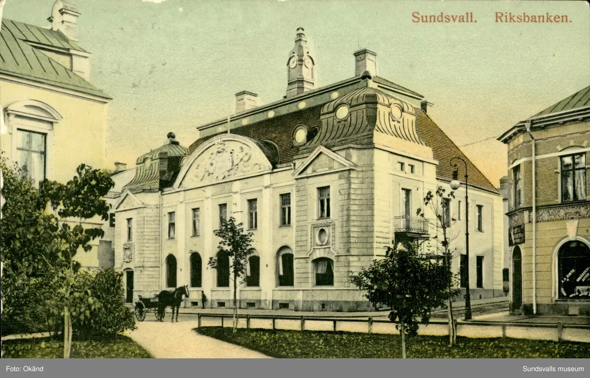 Vykort med motiv över Riksbanken i Sundsvall.