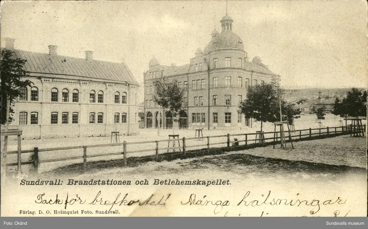Vykort med motiv över Brandstationen och Betlehemskapellet i Sundsvall.