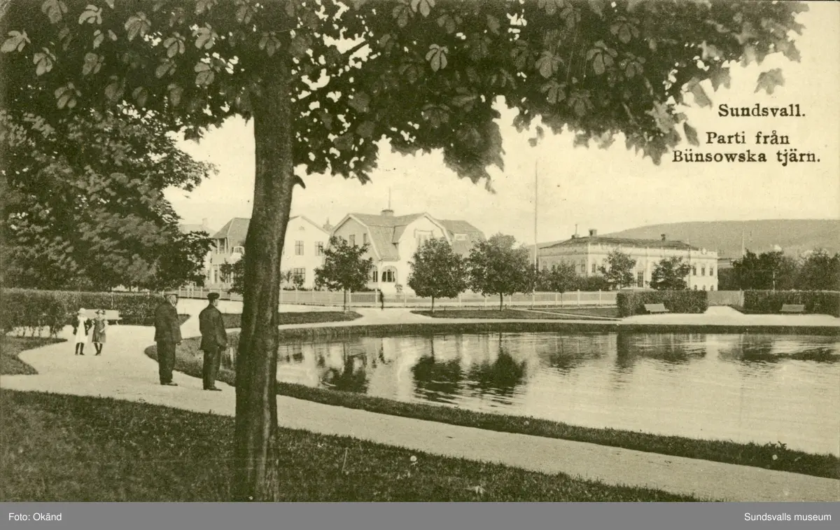Vykort med motiv över Bünsowskatjärnen i Sundsvall.