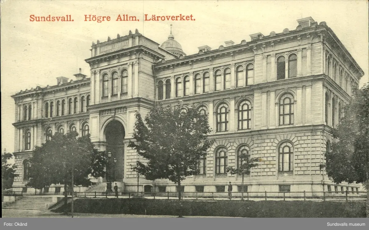 Vykort med motiv över Högre Allmänna läroverket i Sundsvall.