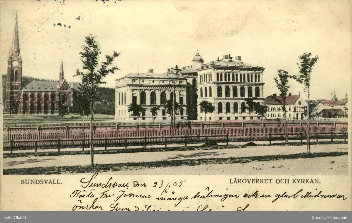 Vykort med motiv över Läroverket och Kyrkan i Sundsvall.