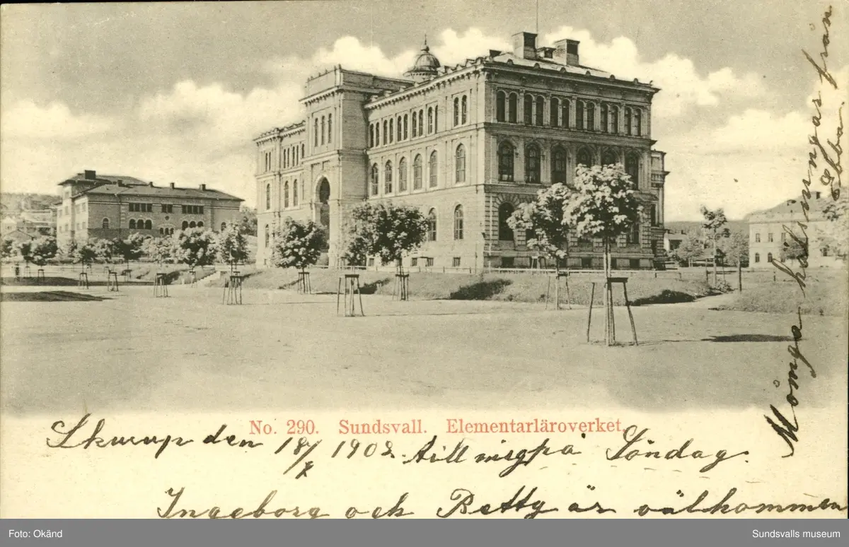 Vykort med motiv över Elementärläroverket i Sundsvall.