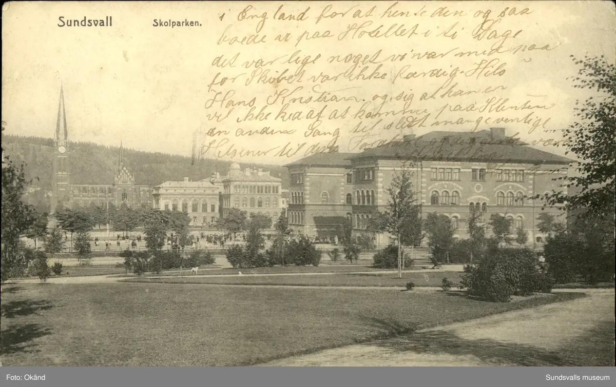 Vykort med motiv över skolparken med skolorna och kyrkan i bakgrunden.