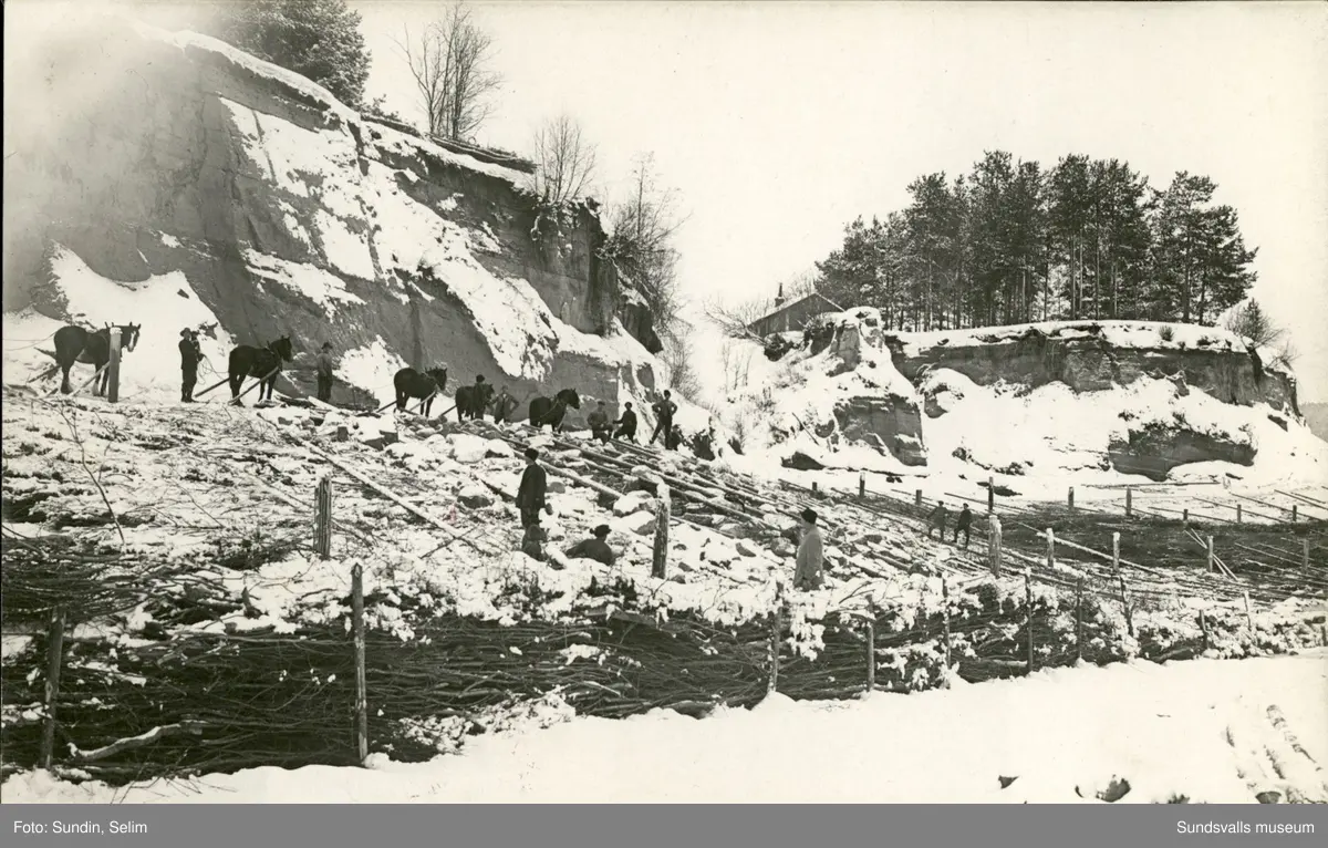 Vykort med motiv över ett flertal män som utför nödhjälpsarbeten i Ragunda 1922.