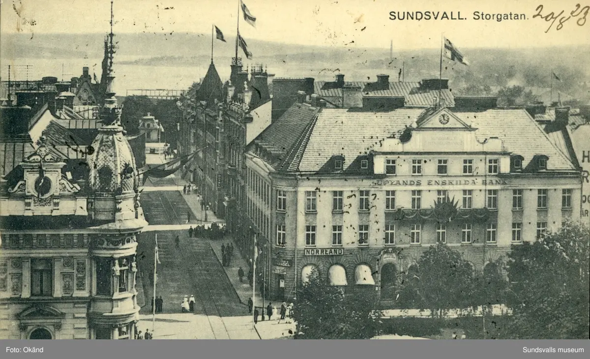 Vykort med motiv över parti av Storgatan i Sundsvall.