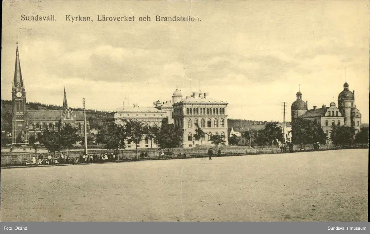 Vykort med motiv över kyrkan, läroverket och brandstationen i Sundsvall.