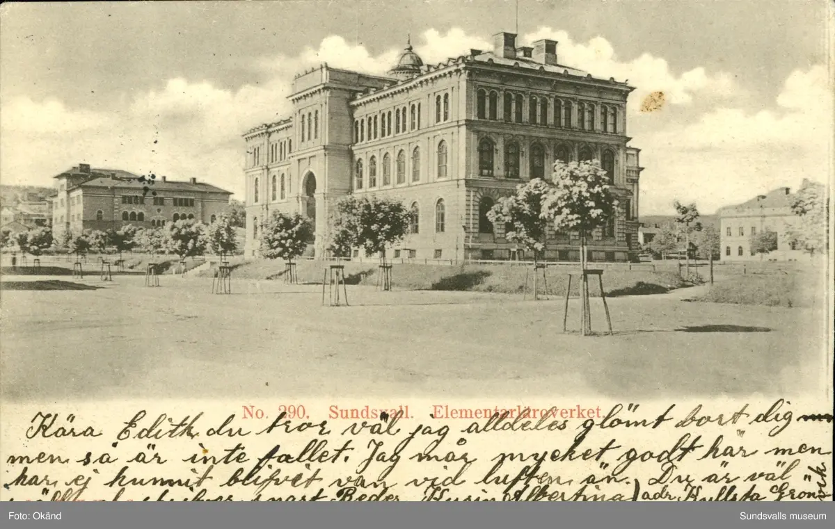 Vykort med motiv över Elementär läroverket i Sundsvall.
