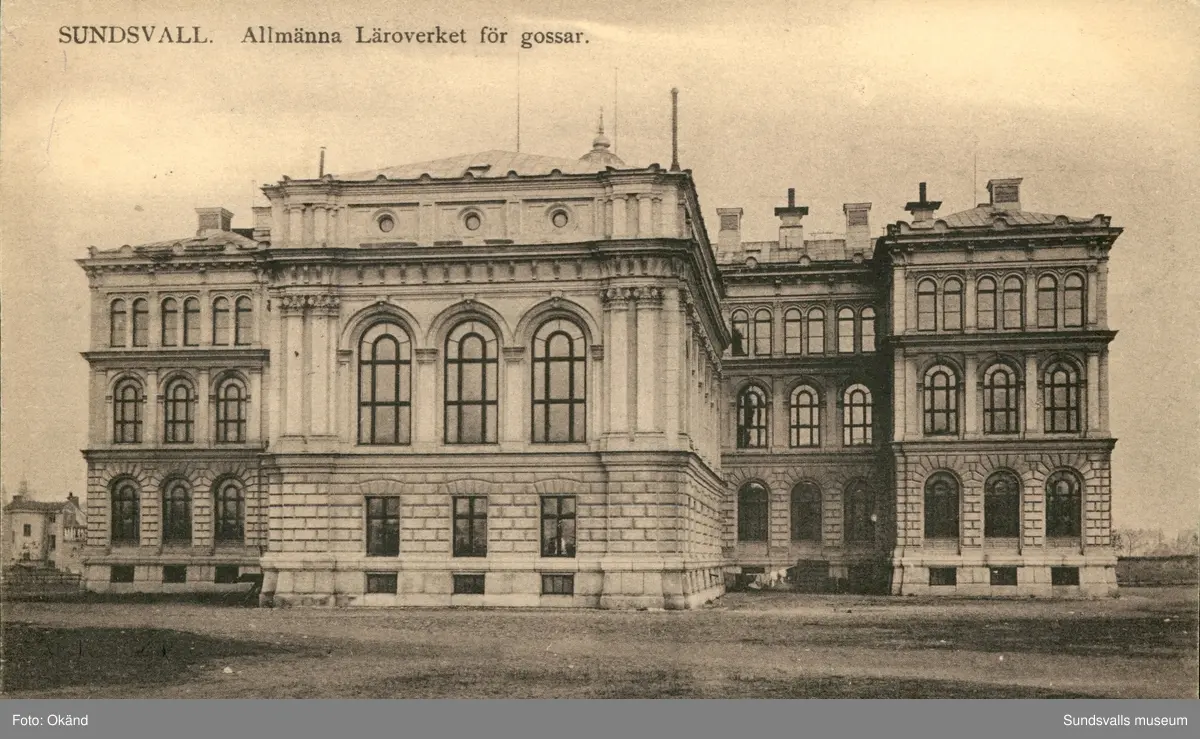 Vykort med motiv över Allmänna läroverket i Sundsvall.
