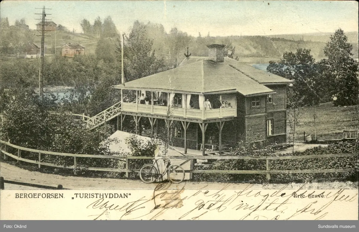Vykort med motiv över Turisthyddan vid Bergeforsen i Timrå.