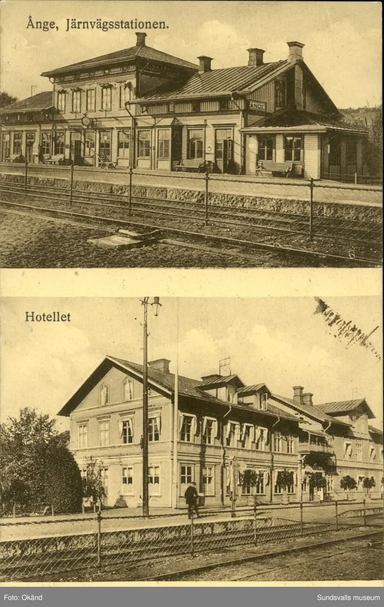 Vykort med motiv på järnvägsstationen och järnvägshotellet i Ånge.