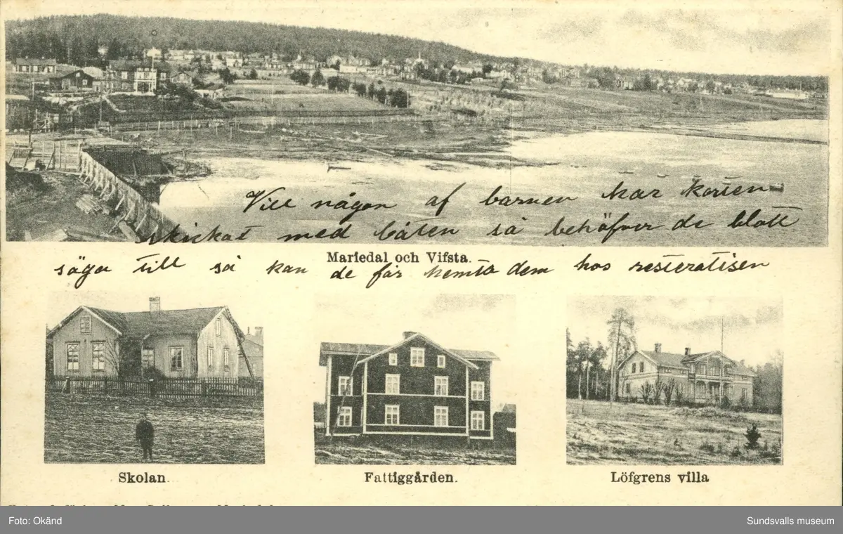 Vykort med motiv av infällda bilder över skolan, fattiggården och Löfgrens villa från Mariedal och Vivsta i Timrå. Kortet sänt till pastor Hempel från fotograf Max Sellman, Östrand.