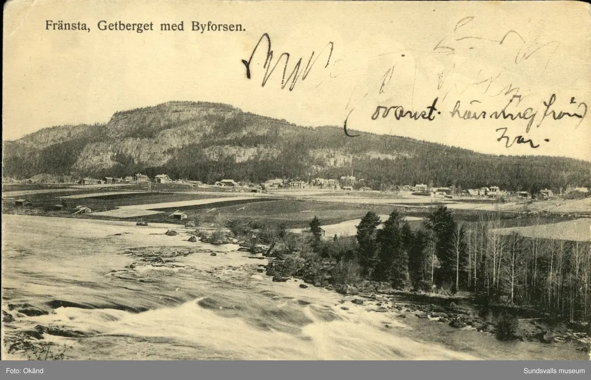 Vykort med motiv över Getberget och Byforsen i Fränsta.