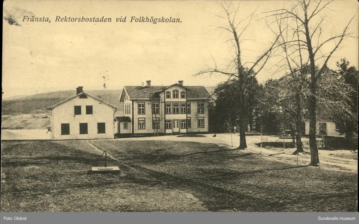 Vykort med motiv över rektorsbostaden vid folkhögskolan i Fränsta.