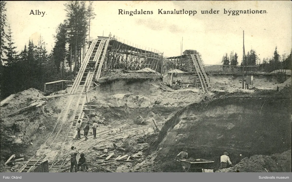 Vykort med motiv över Ringdalens kanalutlopp under byggnationen i Alby.