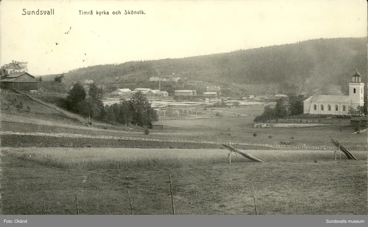 Vykort med motiv över Timrå kyrka och Skönvik.