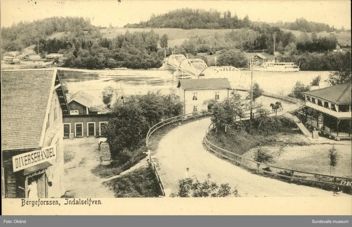 Vykort med motiv taget från södra sidan över Indalsälven och Bergeforsen i Timrå. Båtarna Turisten och Indalen skymtar på var sida om bron.