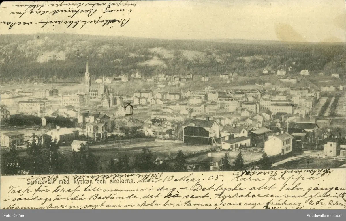 Vykort med motiv över kyrkan och skolorna i Sundsvall.