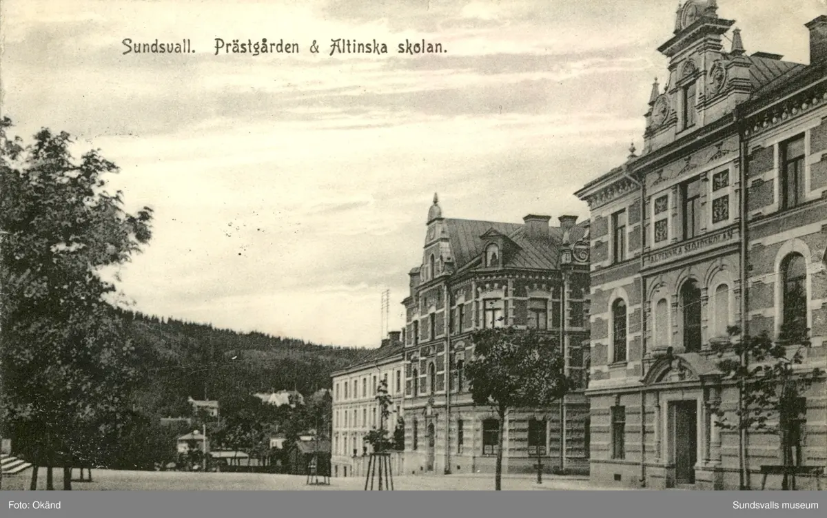 Vykort med motiv över Prästgården och Alltinska skolan i Sundsvall.