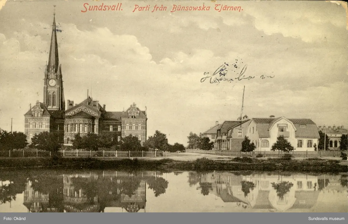 Vykort med motiv över Bünsowska tjärnen och Gustav Adolfs kyrka i bakgrunden.