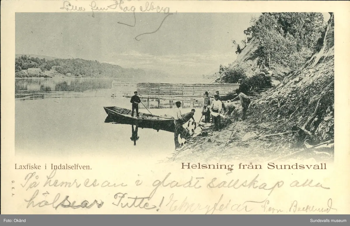 Titel: Vykort med motiv över laxfiske i Indalsälven.
