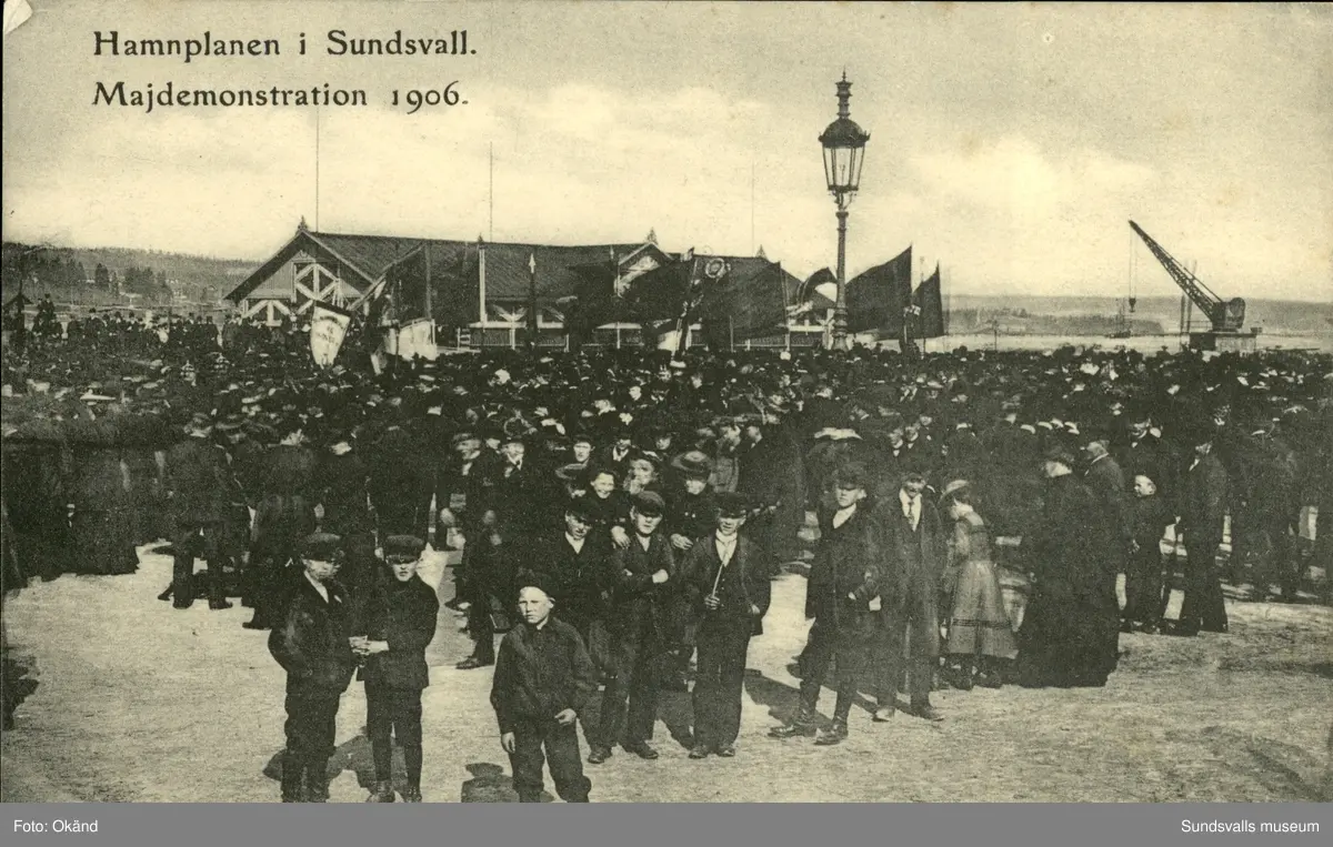 Vykort med motiv över majdemostrationerna på hamnplanen i Sundsvall.